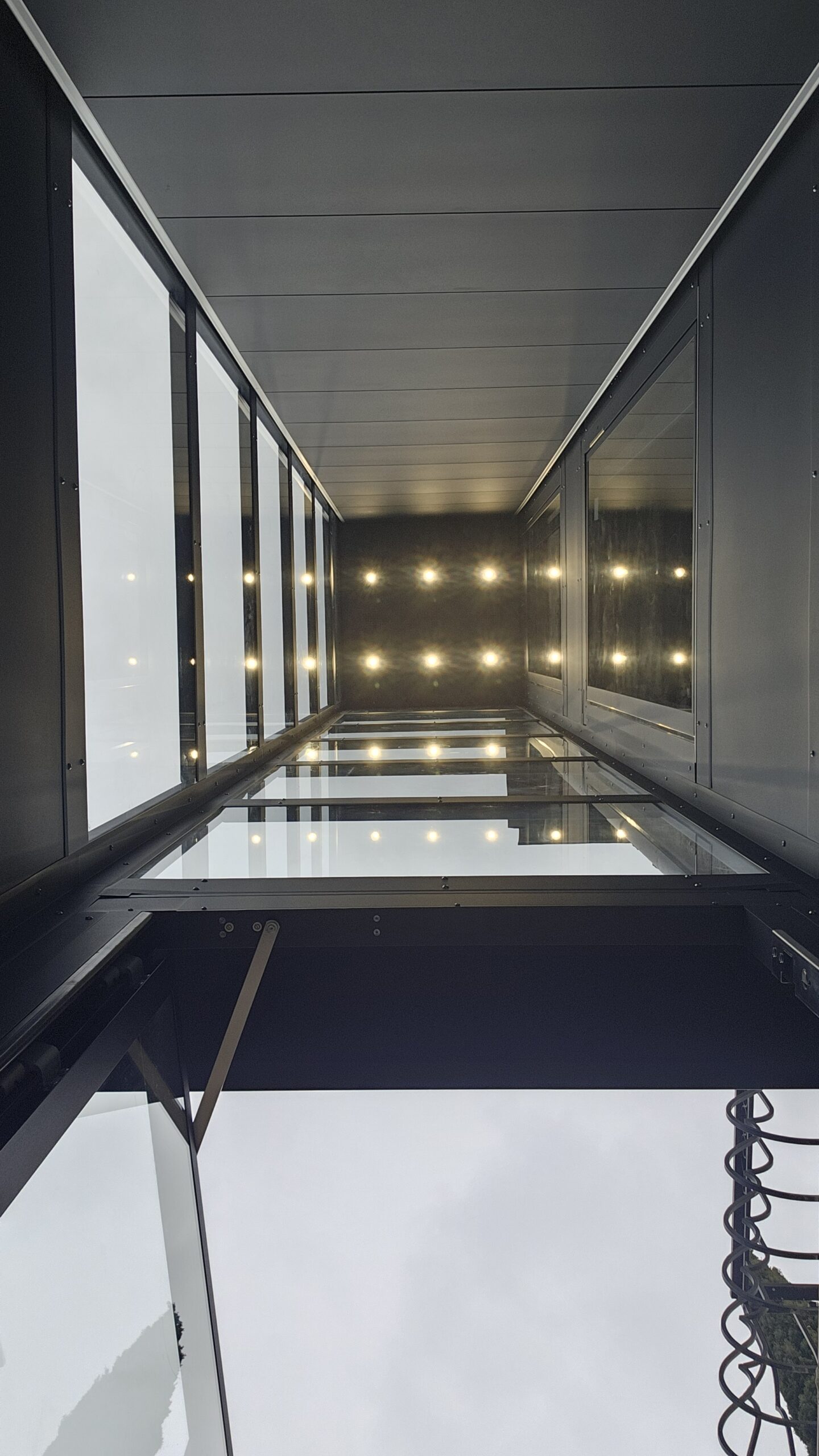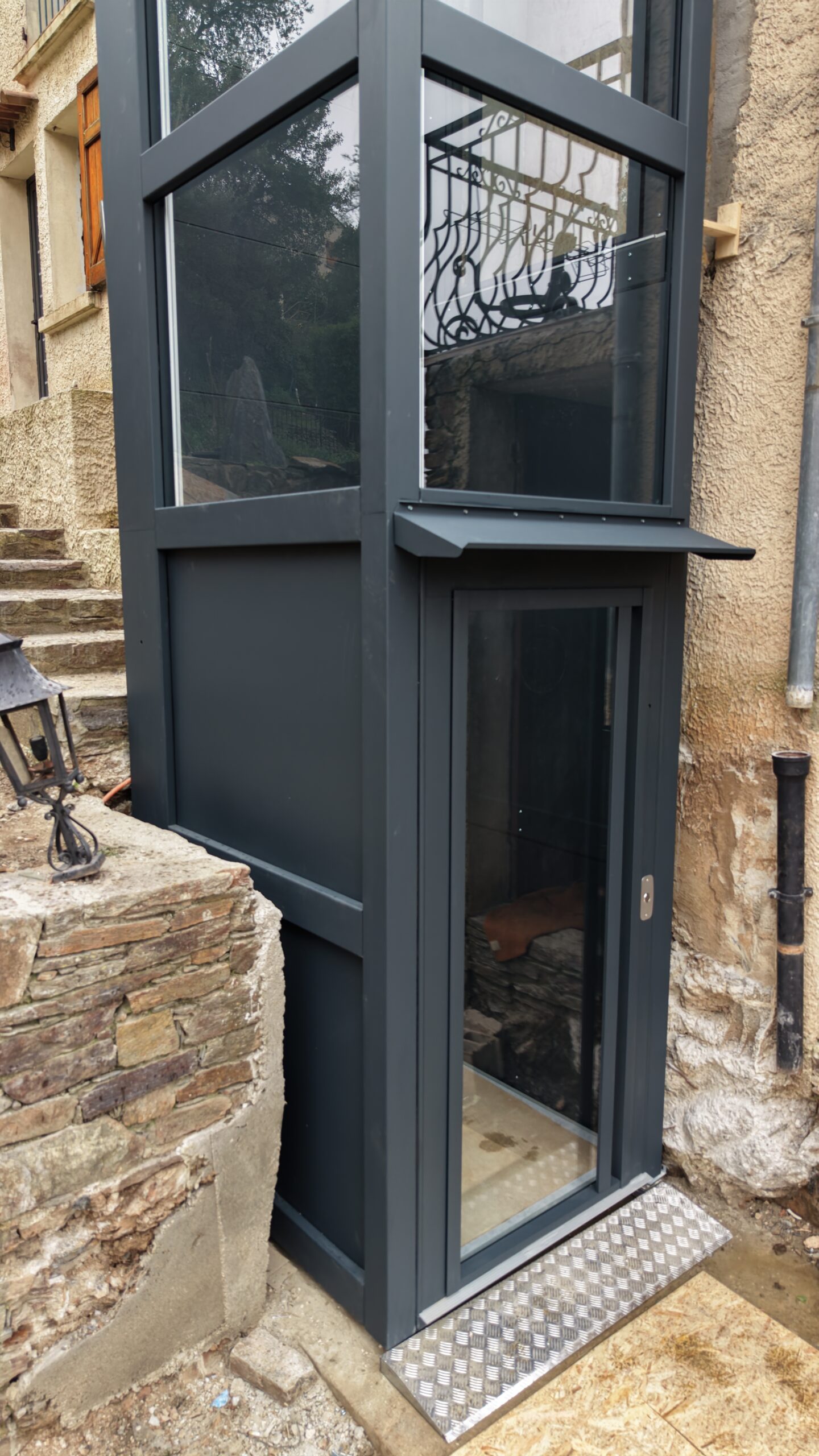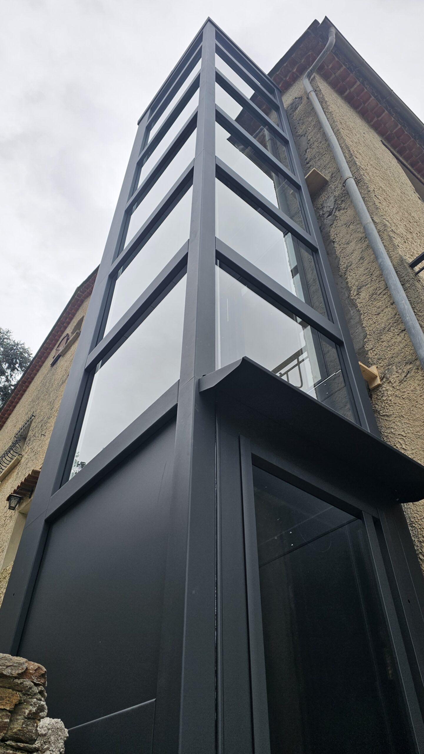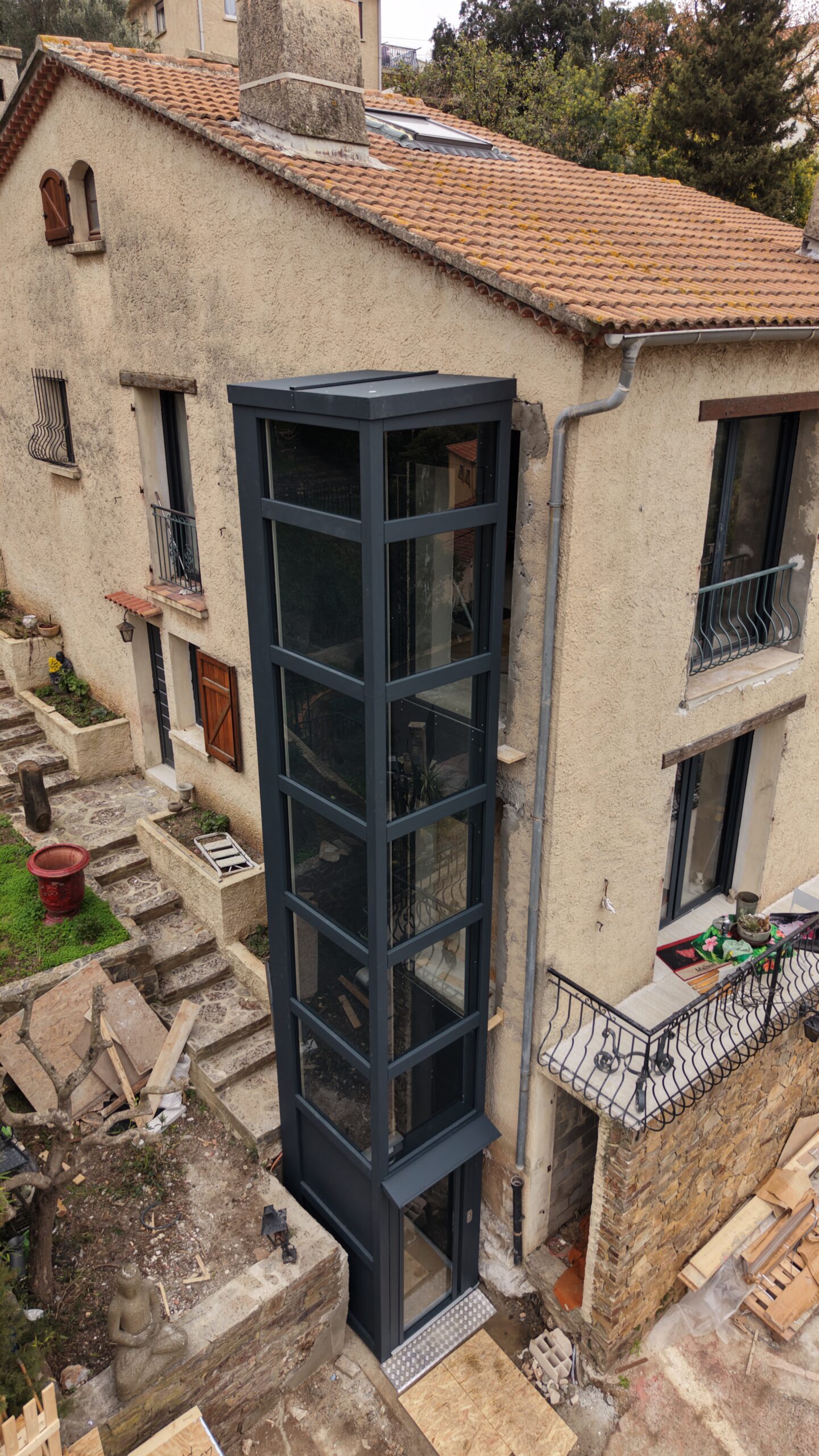 L’esthétique a été un élément clé du projet. L’ascenseur de maison extérieur a été réalisé en coloris RAL 7016, identique aux menuiseries extérieures existantes, afin d’assurer une parfaite cohérence visuelle.
